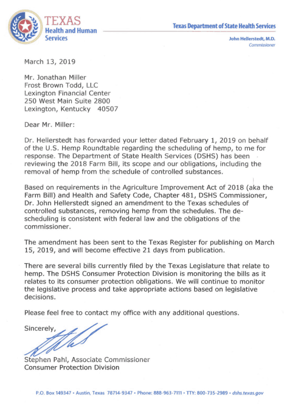 On March 15th, John Hellerstedt, Commissioner of the Texas Department of Health and Human Services, signed an amendment to remove hemp from the list of controlled substances. The amendment was signed and sent to the Texas Register for publishing. It will become effective on April 5th (due to a 21 day processing period).