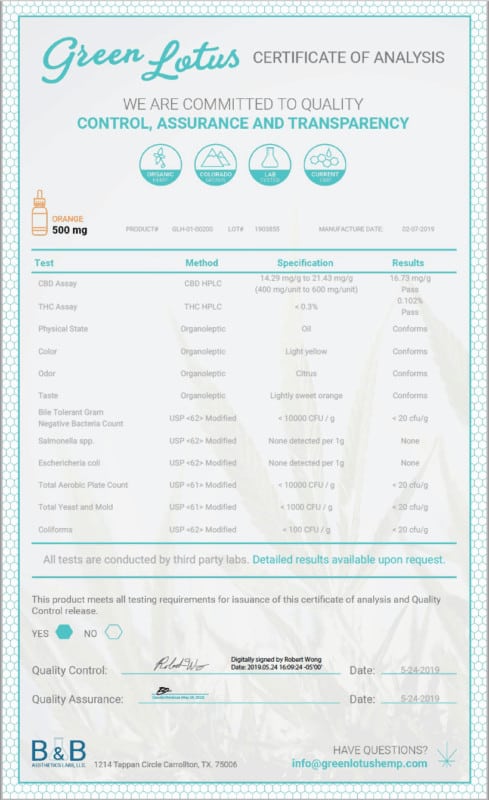 You may have noticed the logo “B&B Aesthetic Labs” at the bottom left of your Certificate of Analysis (COA). B&B Aesthetic Labs is a compounding, manufacturing and quality control facility owned by us, Green Lotus™ Hemp.