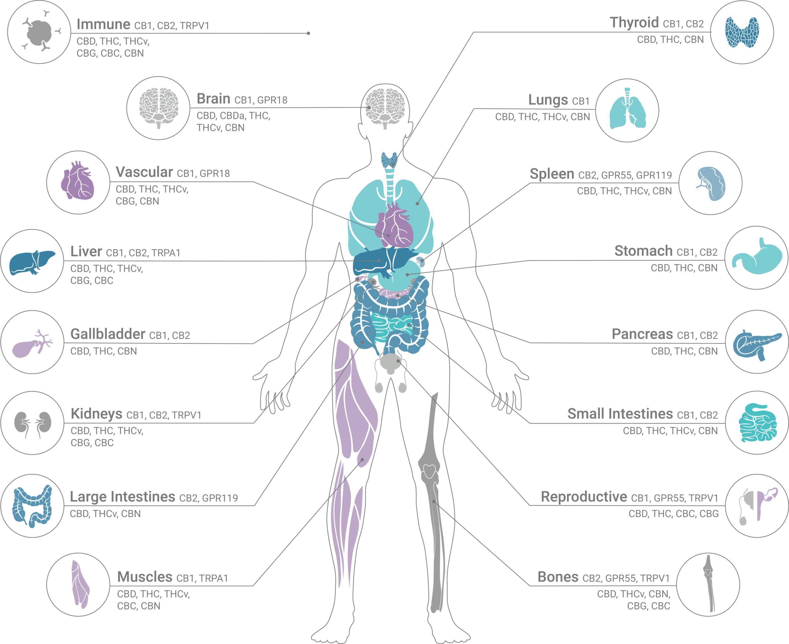 Cannabinoids and Terpenoids bind to a series of Receptors naturally found throughout the body.