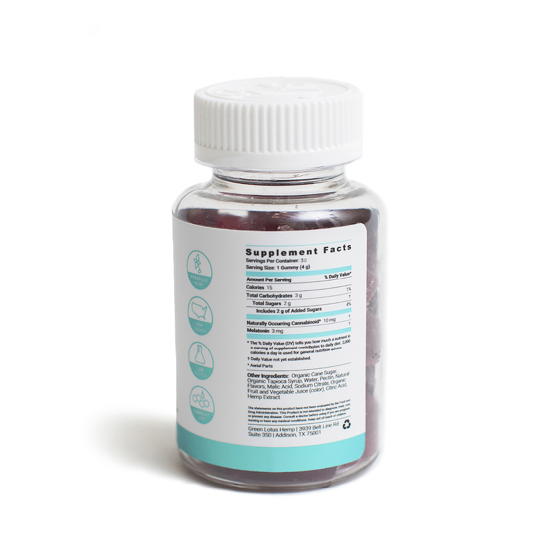 30 count bottle: 300 mg of CBD, 75 mg of melatonin, total. 10 mg of CBD, 3 mg of melatonin per gummy.